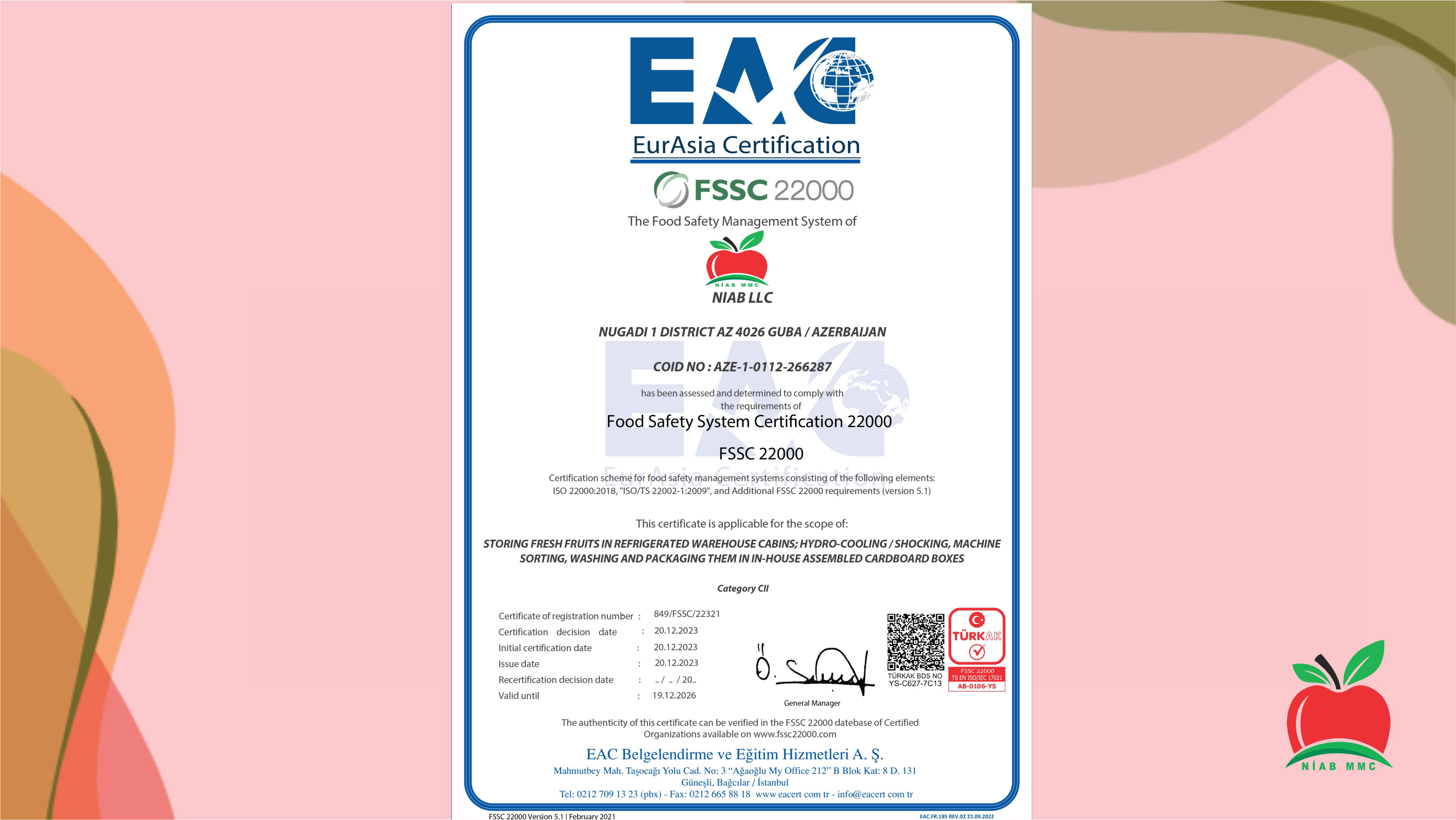“NİAB” MMC müasir texnologiya və avadanlıqların, həmçinin intensiv metodların tətbiqi ilə 2019-cu ilin əvvəlindən başlayaraq Quba rayonunda özünə məxsus 95 hektar ərazidə super intensiv bağçılıq təsərrüfatı təşkil etmişdir. Müəssisənin yaradılmasına əsaslı surətdə yanaşılmışdır. Bakı-Quba yolundan uzunluğu 1,5 km olan asfalt örtüklü yol çəkilmiş, 40 min kub metrlik dəmir beton üzlüklü müasir su anbarı, avtomatik işə düşən yanğınsöndürmə sistemi və yanğın üçün ayrıca 143 kub metrlik su anbarı, 82 kub metrlik içməli su anbarı, avtomatik rejimli nasosxana binası, 100 tonluq tərəzi, elektrik enerjisinin fasiləsiz təminatı üçün generator binası, texnika üçün müasir tələblərə cavab verən qaraj, emalatxana, və s. inşa edilmişdir. Bundan savayı ərazinin 12.000 min kvadrat metri asfaltlanmış, bütün ərazi və binalar isə videomüşahidə sistemi ilə təchiz olunmuşdur. Meyvələrin yuyulması, çeşidlənməsi, qablaşdırılması və saxlanılması üçün ümumi sahəsi 5452 m² olan soyuducu anbar binası mövcuddur. Soyuducu kameralar ümumilikdə 3500 ton meyvə saxlamağa imkan verir. Soyuducu anbar binasının xidmətlərindən tək müəssisənin özü yox, həm də digər istehsalçılar da yararlanırlar. Müəssisə qarşıya qoyduğu hədəflərə nail olmaq üçün kənd təsərrüfatı texnikasının geniş tətbiqinə, ən müasir texnologiyalara və yüksək ixtisaslı işçi heyətinə arxalanır. Təsərrüfatın yaradılması üçün ümumi sayı 20 çatan Türkiyə, İtaliya, Hollandiya, Fransa, İngiltərə, Yaponiya istehsalı olan müasir traktorlar, dərmansəpənlər, çiləyicilər, frez aqreqatları və bu kimi digər texnika alınmışdır. 95 hektarın 40 hektarında alma bağları, 11 hektarında armud, 11 hektarında gilas, 11 hektarında nektarin, 5 hektarında gavalı, 4 hektarında yastı şaftalı, 2 hektarında şaftalı əkilmişdir. Layihədə yüksək məhsuldarlığa malik olan Türkiyədən gətirilmiş tinglərdən istifadə olunmuşdur. Su ehtiyatlarına qənaət edən müasir damcılı suvarma sistemi qurulmuşdur. Müəssisə hər il 3000-3500 ton məhsul istehsal edir ki, bunun da bir hissəsi xarici bazarlara ixrac olunur. Gələcəkdə meyvə sahələrinin artırılması və ixracın genişləndirilməsi nəzərdə tutulur. “NİAB” MMC-nin əsas məqsədi – NİAB brendini həm Azərbaycanda, həm də xarici bazarlarda yüksək keyfiyyət və misilsiz dad simvoluna çevirməkdir.